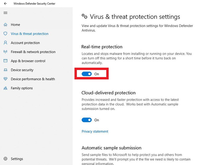 - Chuyển trạng thái tùy chọn Real-time protection sang OFF.