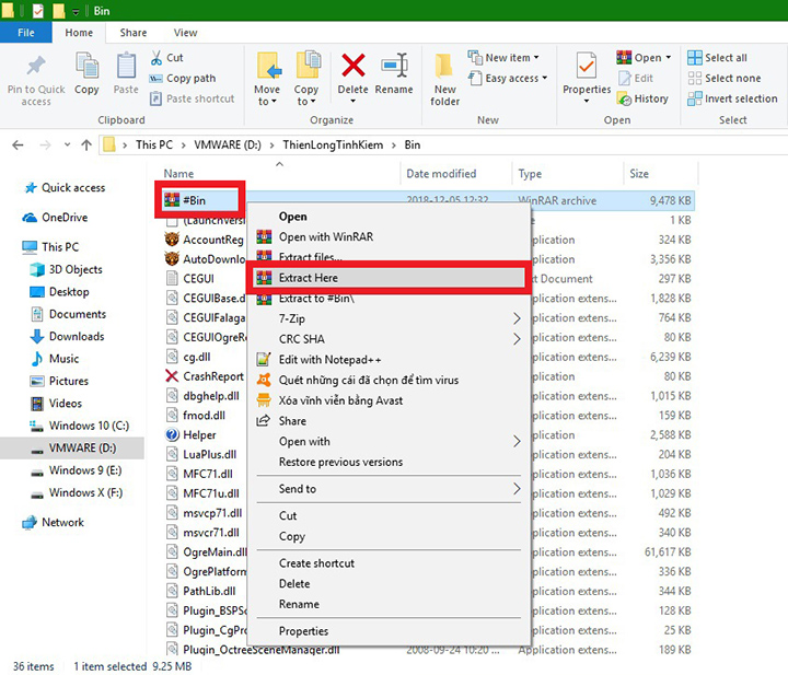 - Trong thư mục Bin tìm file #Bin.rar nhấn chuột phải vào #Bin.rar và chọn Extract here