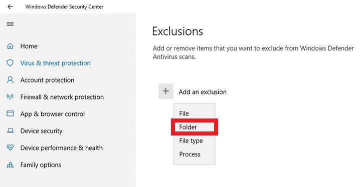 - Trong mục Exclusions nhấn vào dấu cộng và chọn Folder